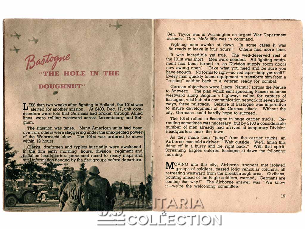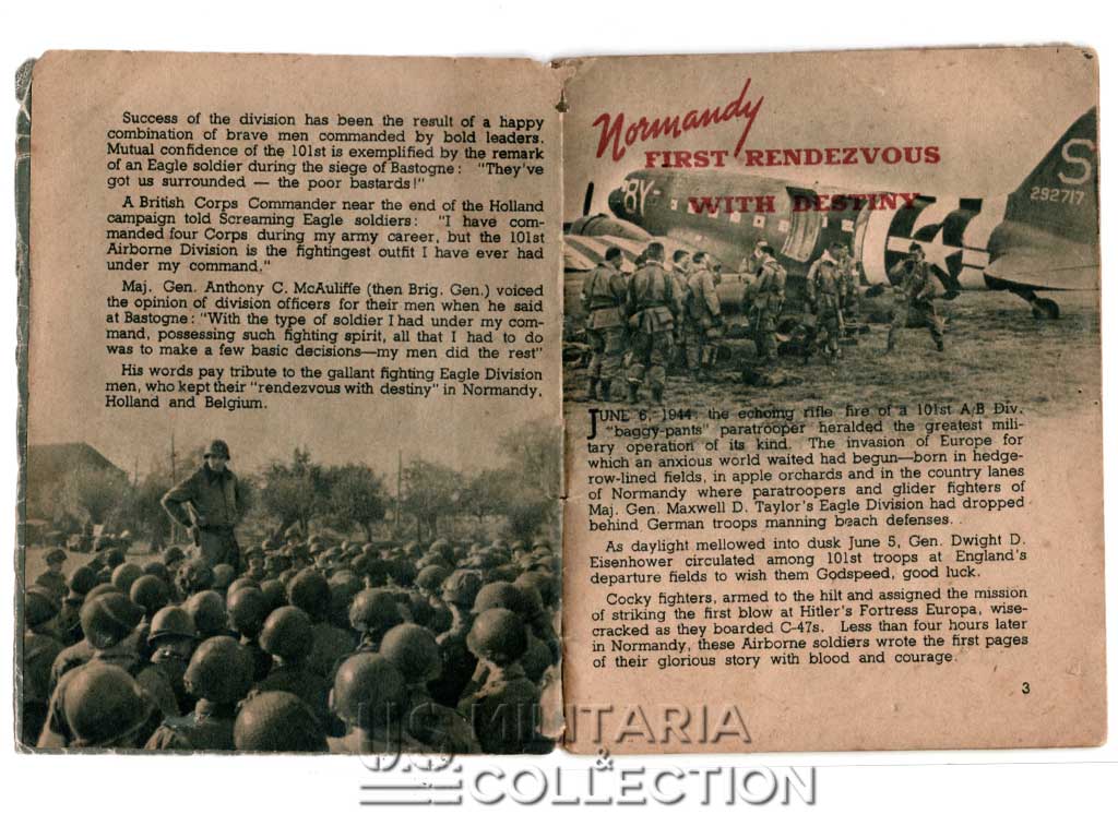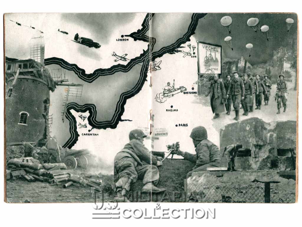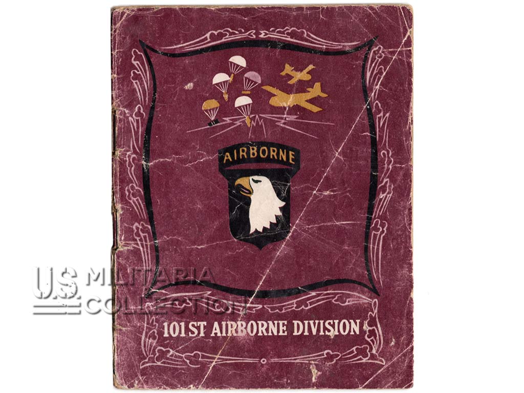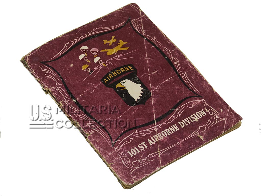 Livret original retraçant l’historique des campagnes et combats menés par la 101st Aiborne. Normandie, Hollande, Bastogne,… Ce livret fait partie de la série de livrets « G.I. Stories » retraçant l’histoire des divisions américaines en ETO. Ils furent diffusés dans le quotidien Stars and Stripes destiné aux forces armées américaine à l’étranger. L’impression fut réalisée à Paris par l’imprimerie Desfossé en 1944-1945. Ces livrets « souvenirs » étaient destinés aux membres de ces divisions ayant combattu en ETO. Certains livrets comportent une page permettant au soldat d’y inscrire son nom, sa compagnie ses notes personnelles,…