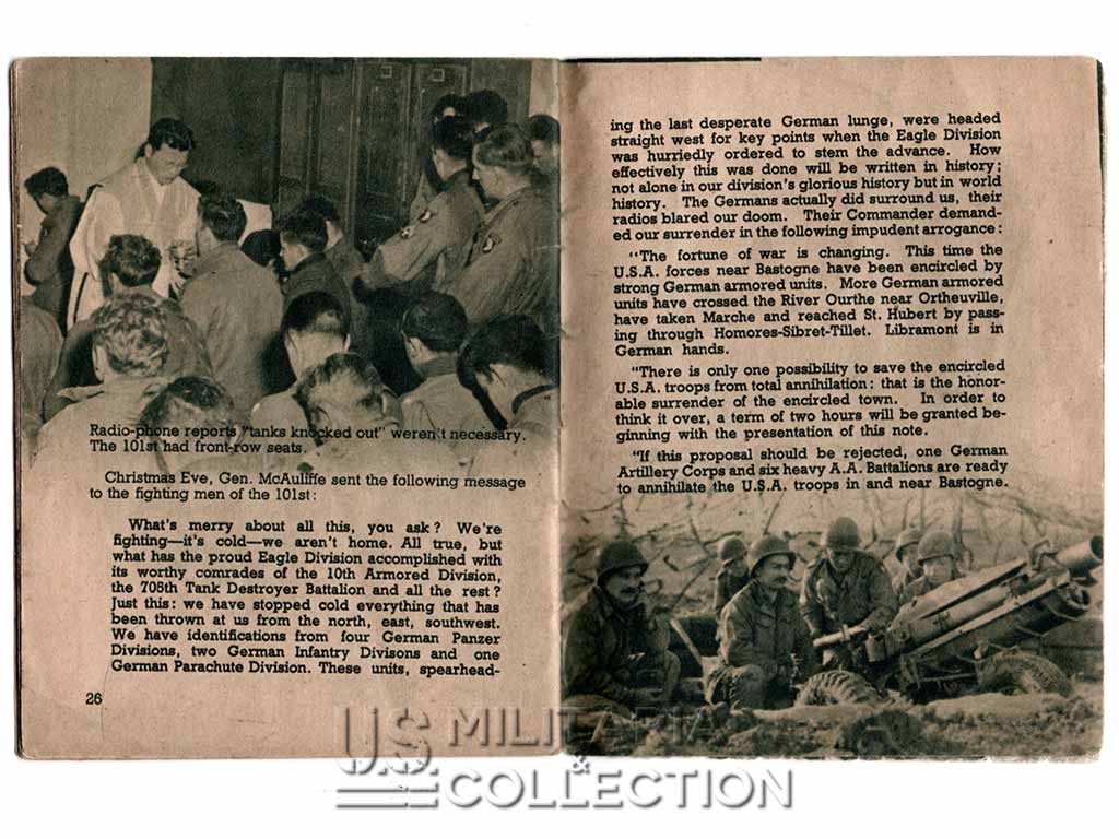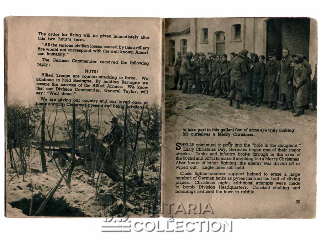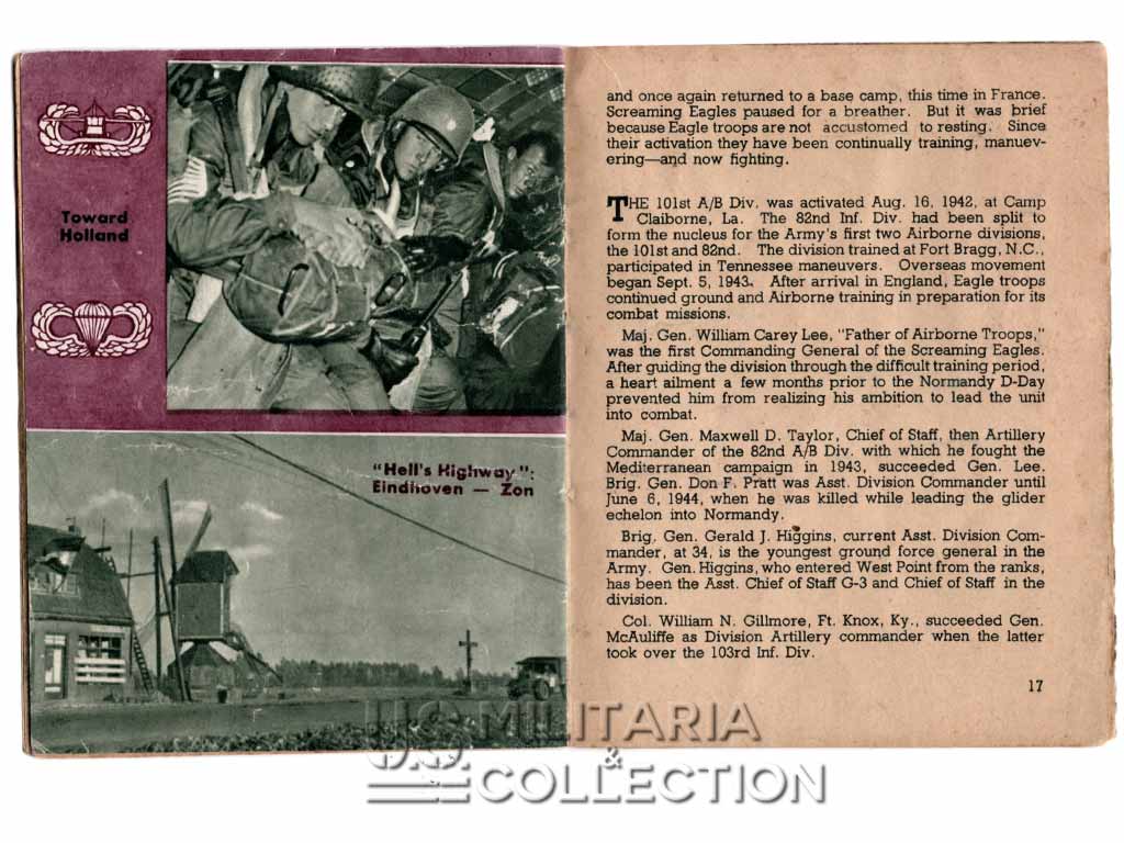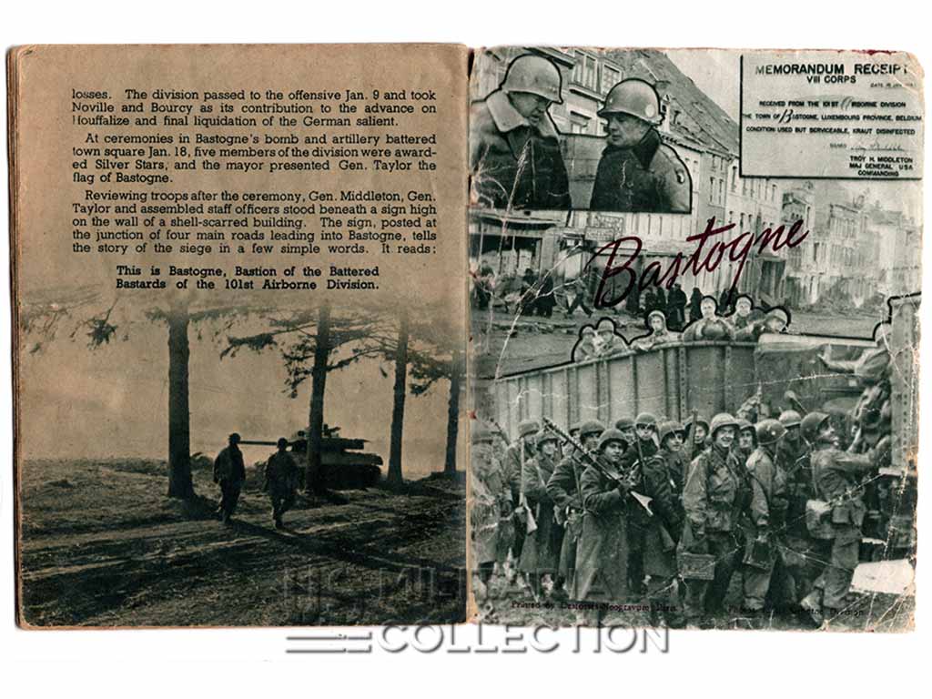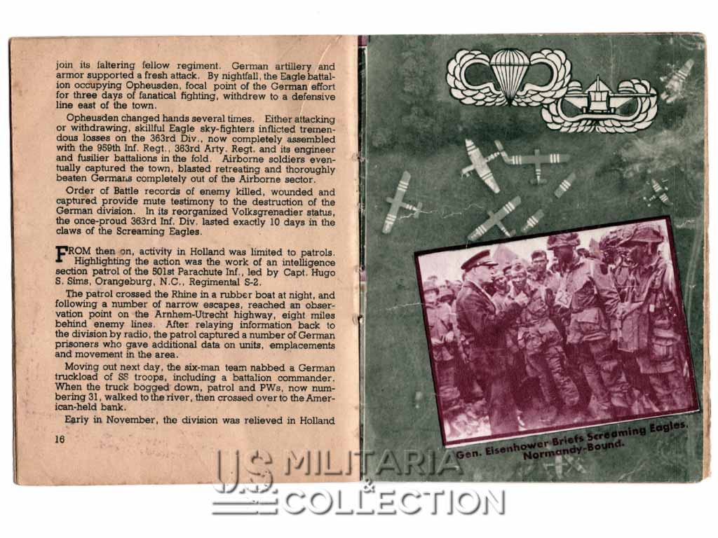 Livret original retraçant l’historique des campagnes et combats menés par la 101st Aiborne. Normandie, Hollande, Bastogne,… Ce livret fait partie de la série de livrets « G.I. Stories » retraçant l’histoire des divisions américaines en ETO. Ils furent diffusés dans le quotidien Stars and Stripes destiné aux forces armées américaine à l’étranger. L’impression fut réalisée à Paris par l’imprimerie Desfossé en 1944-1945. Ces livrets « souvenirs » étaient destinés aux membres de ces divisions ayant combattu en ETO. Certains livrets comportent une page permettant au soldat d’y inscrire son nom, sa compagnie ses notes personnelles,…
