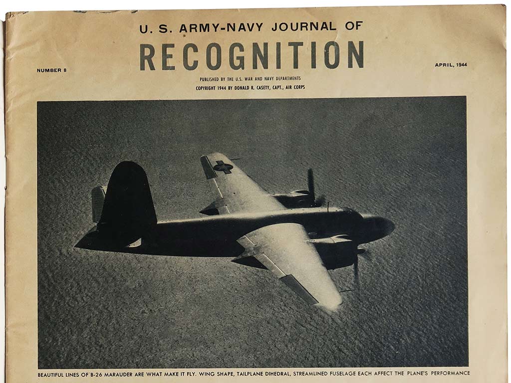 Magazine de l’US Army, Navy, origine Seconde Guerre mondiale. Mensuel destiné à faire connaître les nouveautés importantes en matière de reconnaissance. Aviation, marine, troupes blindées. Article sur le développent des planeurs, CG-4A, CG-13, Horsa, Hamilcar. Magazine complet de 52 pages, 214 photos, illustrations et dessins de silhouette d’avions. La Pin-up de dernière page est un Lockheed P-38,…